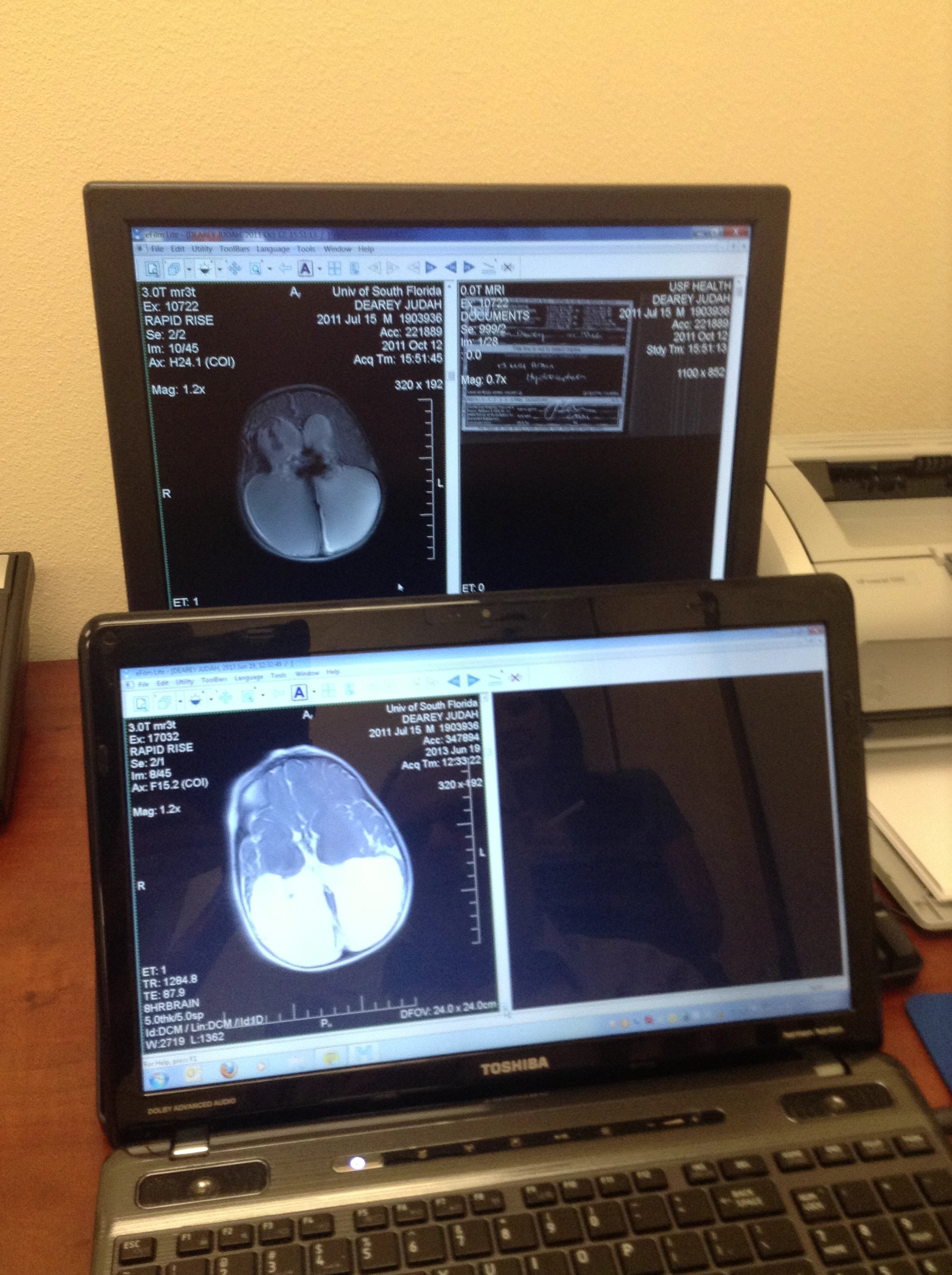 Here are some before and after pictures from Judah’s MRI. In the back is the original MRI at 3 months old. On the front screen is the MRI from Wednesday. The white area that you see is fluid that filled in where the brain tissue died away. You’ll notice that in the original MRI there is a little bit of brain tissue in the frontal lobe, but the rest was gone. In the front picture you can see considerably less fluid and lots more brain tissue!!!! Our doctor said Judah has grown almost 50% of his brain back!